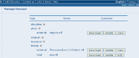 From the thesaurus administration interface, click on the edit button for a local thesaurus or the view button for an external thesaurus. This interface allows: