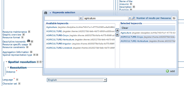 When editing an ISO metadata record, a keyword (or concept) picker can be used which allows the editor to: