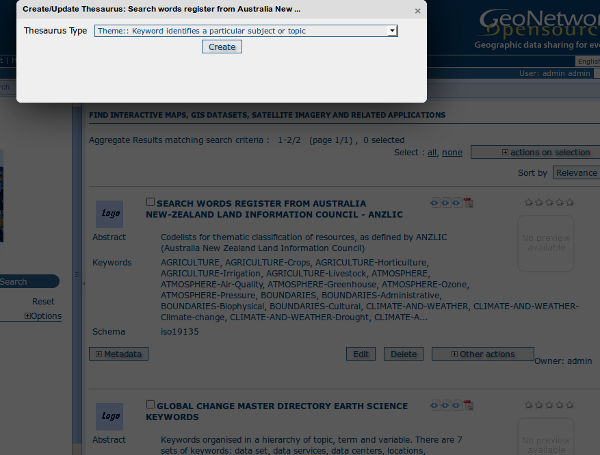 An ISO19135 record in the local GeoNetwork catalog can be turned into a SKOS file and used as a thesaurus in GeoNetwork. ISO19135 records not in the local catalog can be harvested from other catalogs (eg. the catalog of the organisation that manages the register). Once the ISO19135 register record is in the local catalog, the process of turning it into a thesaurus for use in the keywords selector begins a search for the record. Having located the record in the search results, one of the actions on the record is to 'Create/Update Thesaurus'.