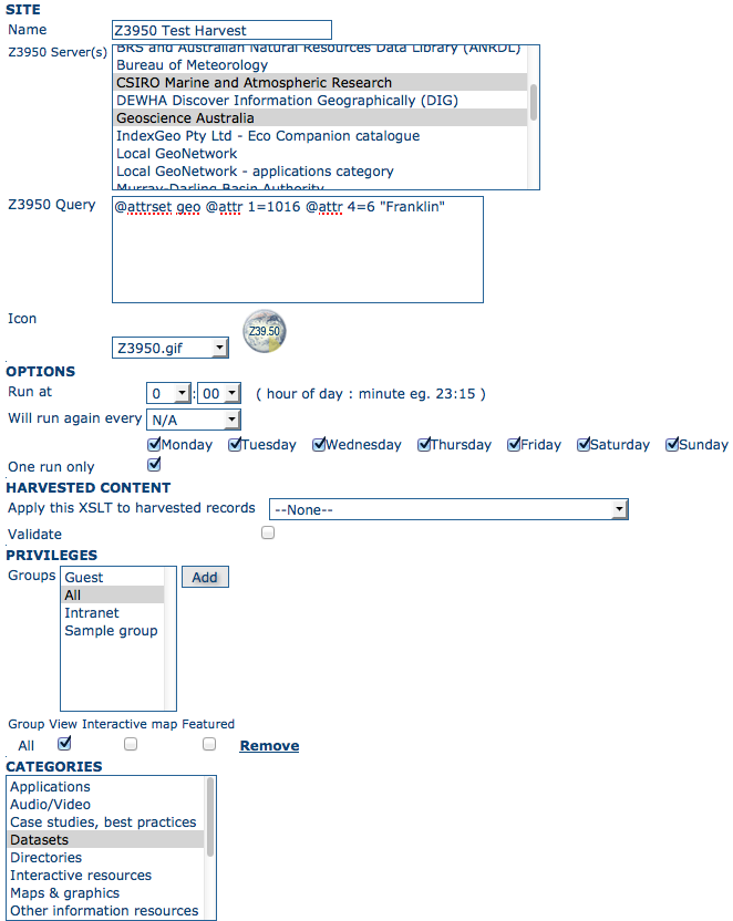 this harvester automatically creates a new Category named after each of the Z3950 servers that return records. Records that are returned by a server are assigned to the category named after that server.